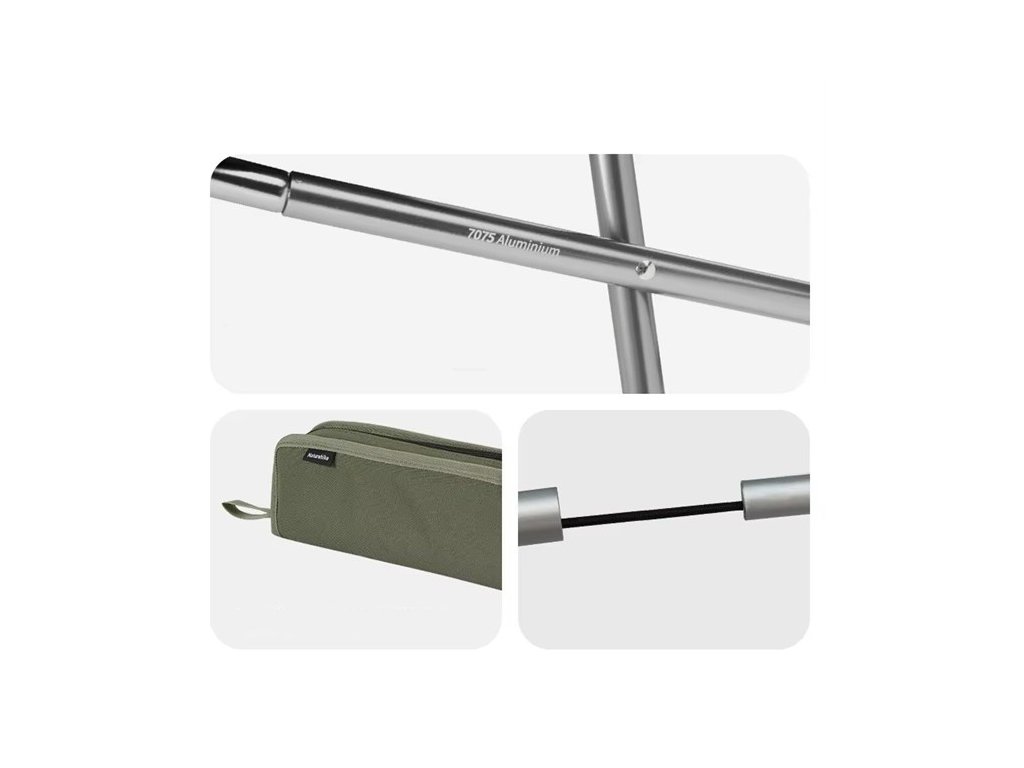 Der Stuhl verfügt über einen hochwertigen Aluminiumrahmen mit X-förmiger Kreuzstütze, wodurch er auch auf unebenem Gelände stabil und widerstandsfähig ist. Die Konstruktion ist so ausgelegt, dass sie eine normale Tragfähigkeit von 120 kg und eine maximale Belastung von 180 kg bietet, wodurch sie sowohl für normale Ausflüge als auch für anspruchsvollere Outdoor-Aktivitäten geeignet ist. Robuste Materialien und ein durchdachter Mechanismus gewährleisten eine zuverlässige Nutzung auch bei langfristiger Belastung.