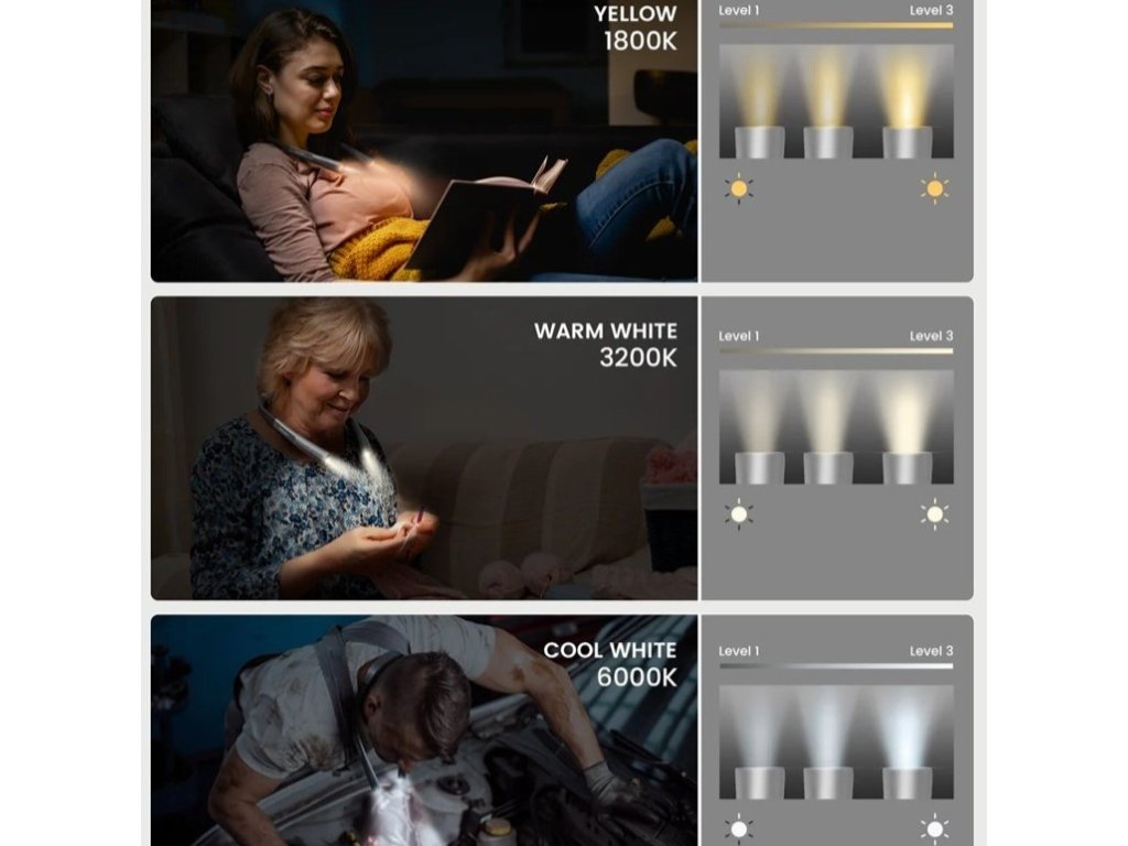 Glocusent bietet 3 Lichtfarbmodi und 3 Helligkeitsstufen, sodass Sie die Beleuchtung einfach an die jeweilige Situation anpassen können. Gelbes Licht (1800 K) ist besonders augenschonend und ideal zum Lesen im Bett, warmweißes Licht (3400 K) eignet sich für normales Lesen und kaltweißes Licht (6000 K) unterstützt die Konzentration bei detailreicher Arbeit. Die Bedienung ist intuitiv auf beide Arme verteilt – einer dient zum Ein- und Ausschalten sowie für den Timer, der andere zur Einstellung von Lichtfarbe und Helligkeit. Das Licht ist flimmerfrei und mit gefiltertem Blauanteil, sodass es die Augen von Kindern, Erwachsenen und Senioren nicht ermüdet.