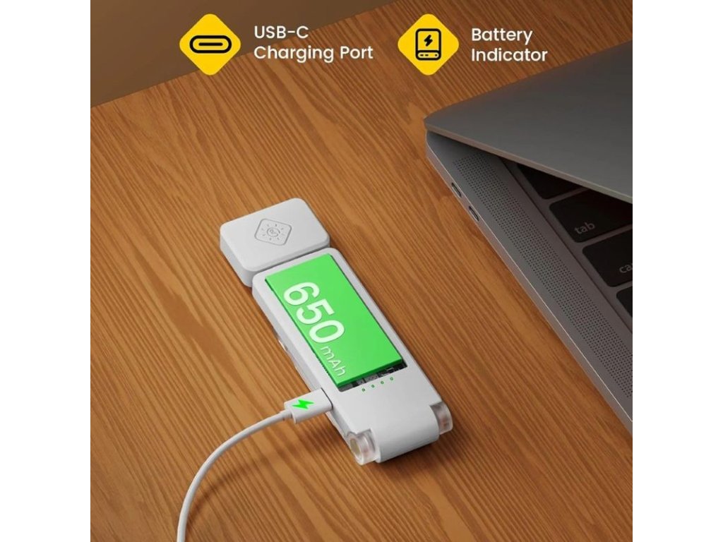 Der integrierte Akku mit 650 mAh ermöglicht eine Laufzeit von bis zu 100 Stunden. Bei nur 30 Minuten Lesezeit pro Tag reicht eine Ladung somit für mehrere Monate. Die Lampe wird über USB-C aufgeladen, und vier übersichtliche Kontrollleuchten zeigen jederzeit den aktuellen Akkustand an. Kein lästiges Unterbrechen des Lesens mehr wegen eines leeren Akkus.