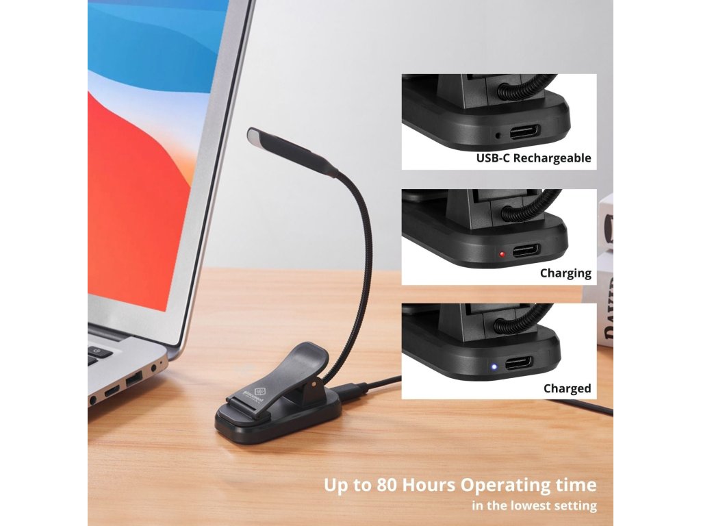 Die Lampe hält bis zu 80 Stunden bei niedriger Helligkeit durch und wird über USB‑C aufgeladen. Die starke Klammer und der flexible Hals ermöglichen eine einfache Einstellung des Winkels und Befestigung überall, wo Sie es benötigen.