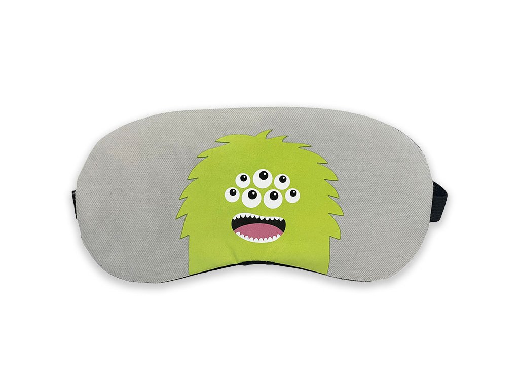 Graue Schlafmaske, bedruckt mit einem grünen Monster. Bequem, angenehm auf dem Gesicht und schützt die Augen vor Licht. Die Maske dient auch zur Unterhaltung der Kinder.