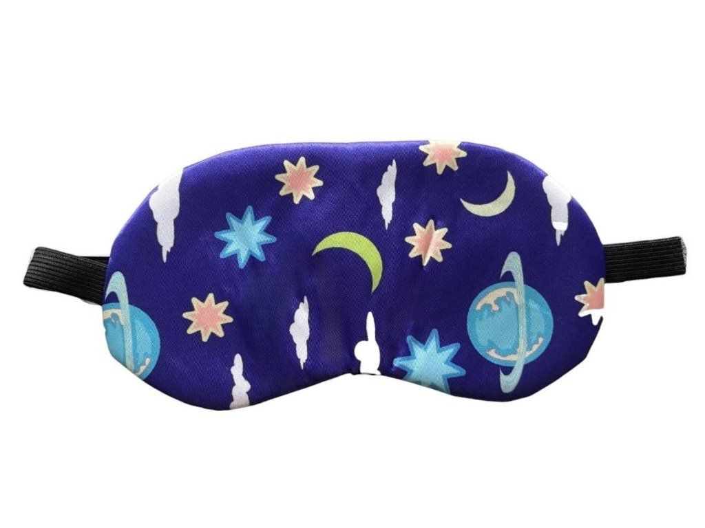 Eine Schlafmaske mit Weltraum-Motiv. Bequem, angenehm auf der Haut und schützt die Augen vor Licht.