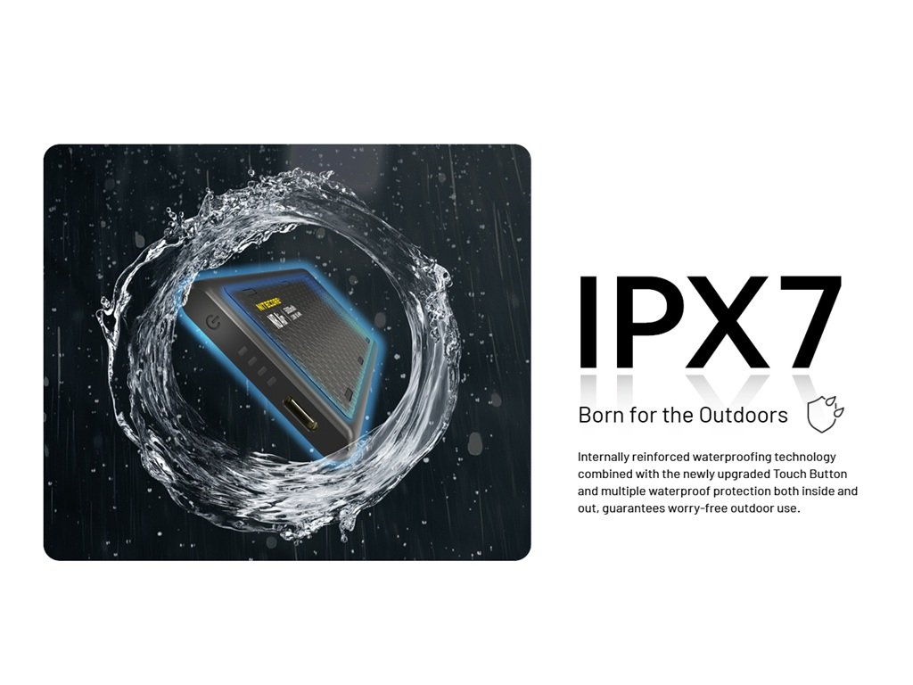 Die Powerbank ist mit intelligentem Überhitzungsschutz, Überladungsschutz, präziser Leistungsanzeige und optimierter Effizienz beim Laden und Entladen ausgestattet. Kurzschluss- und Überspannungsschutz sind selbstverständlich. Mit IPX7-Zertifizierung ist sie resistent gegen Regen, Schnee und hohe Luftfeuchtigkeit – perfekt für den Einsatz bei schlechtem Wetter. Auch extremen Bedingungen beim Camping oder in den Bergen hält sie stand.