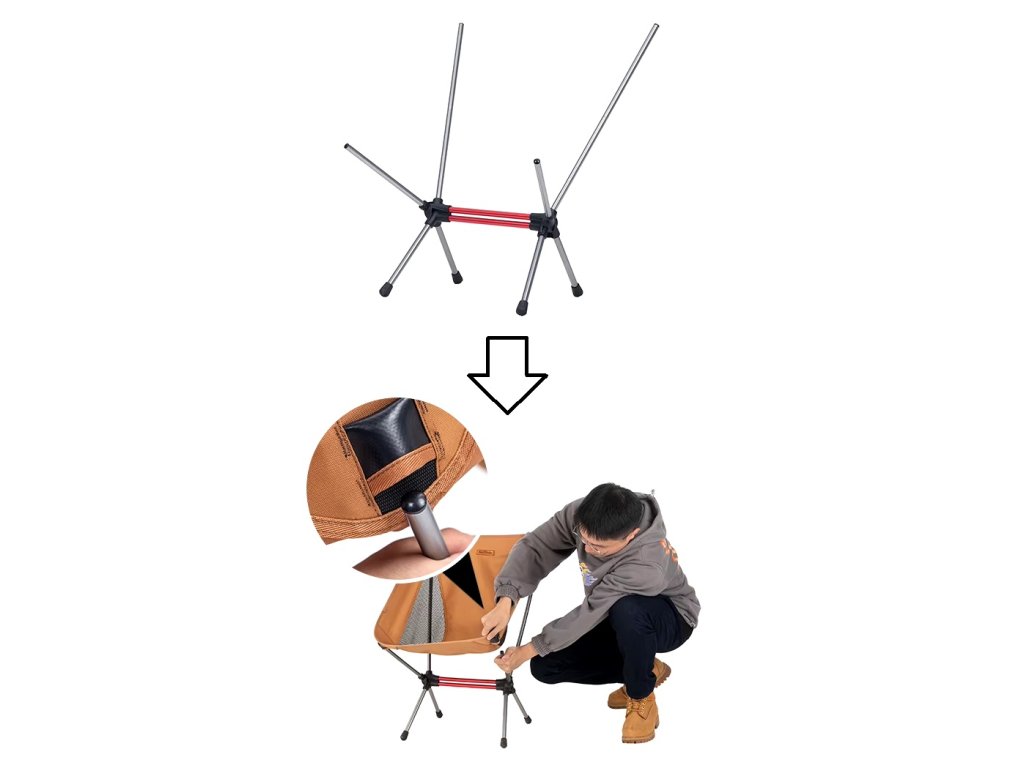Der Aluminiumrahmen des Stuhls ist für einfaches Zusammenklappen ausgelegt. Die interne Verbindung mit elastischen Schnüren stellt sicher, dass jedes Teil des Stuhls genau an seinen Platz passt. Es reicht aus, die Leinensitzfläche einfach zu spannen, und der Stuhl ist einsatzbereit. Dank dieses cleveren Systems sind keine Werkzeuge erforderlich, sodass auch ein Anfänger den Stuhl problemlos zusammenklappen kann.