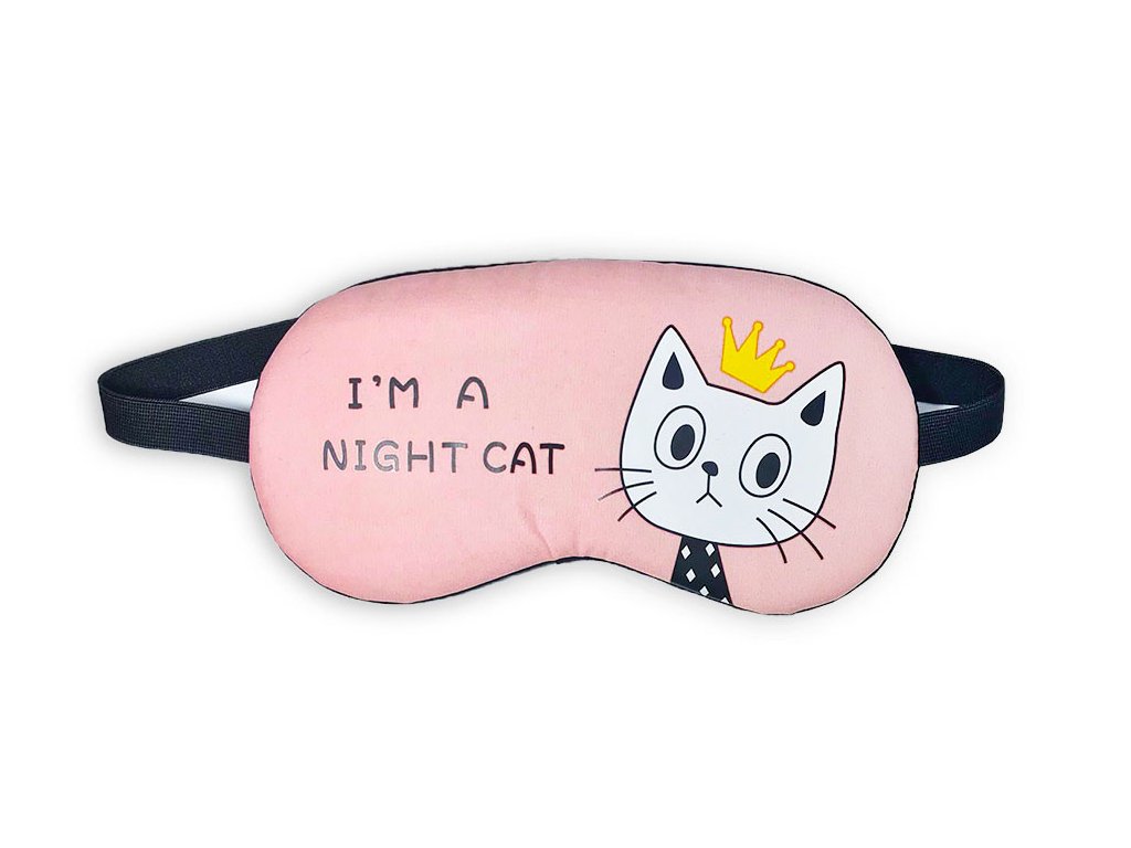 Schlafmaske aus Baumwolle in Rosa mit Katzenmotiv und Aufschrift I'm a night cat. Bequem, angenehm auf dem Gesicht und schützt die Augen vor Licht. Die Maske kann auch als Unterhaltung für Kinder dienen.