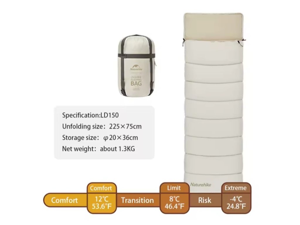 Der Naturehike LD150 ist die ideale Wahl für Frühling, Sommer und Frühherbst. Er bietet angenehme Wärme bei Temperaturen, bei denen kein schwerer Winterschlafsack notwendig ist, man aber auch nicht frieren möchte. Die Füllung mit einer Dichte von 150 g/m² isoliert gut und ermöglicht gleichzeitig den Abtransport von Feuchtigkeit – so schwitzt man selbst in wärmeren Nächten nicht. Die Materialien sind angenehm auf der Haut, strapazierfähig und pflegeleicht. Das Außen- und Füllmaterial besteht aus Polyester, das sich wie Baumwolle anfühlt.